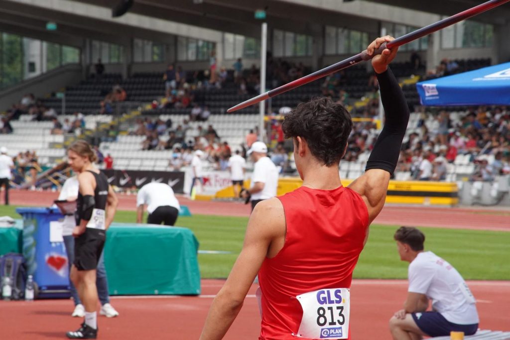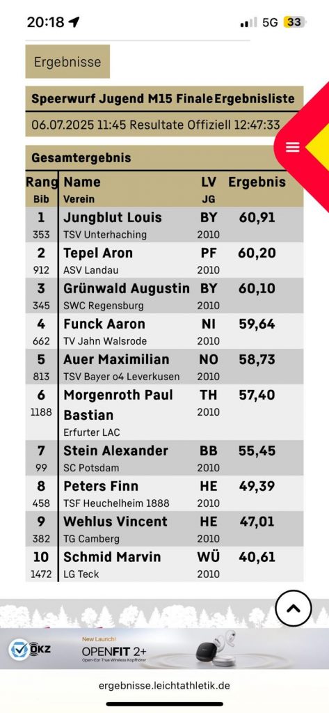 Am Sonntag, den 6.07.2025 war es dann endlich soweit; um 11.45 Uhr startete die Konkurrenz im Speerwurf der Altersklasse M15 in ihren Kampf um die Medaillen. Als siebenter im Feld ließ Max, der aufgrund der Meldeweiten das erste Mal als „Underdog“ in einen Wettkampf ging, seinen schwarz-roten Speer fliegen. Und wie! Das Wurfgerät fand erst nach 58,73m zum Boden zurück. Das bedeutete gleich im ersten Wurf eine Verbesserung der eigenen PB um gute dreieinhalb Meter und zunächst Rang zwei. In Versuch Nummer zwei gelang ihm zwar eine noch größere Weite, allerdings wurde dieser wegen Übertretens ungültig gewertet. In den dritten Versuch startete Max als Drittbester und hielt den Bronzerang bis zum abschließenden sechsten Versuch. Aus Max´Sicht leider fanden zwei seiner Konkurrenten in eben diesem letzten Versuch zu ihren Möglichkeiten zurück und warfen sich auf die Plätze drei und vier. Max, ein großer Sportler mit Kämpferherz, wollte entsprechend antworten. Leider knickte ihm bei seinem Wurf das Stemmbein weg, so dass keine Verbesserung zu erreichen war. Damit erzielte er den fünften Rang in der Gesamtwertung, was mehr als respektabel ist! Als Ergänzung ist zu erwähnen: Max hat in einer beeindruckend konstanten Serie aus sechs Würfen (fünf davon gültig) jedes Mal seine bisherige Bestweite übertroffen. Herzlichen Glückwunsch zu dieser herausragenden Leistung und viel Erfolg bei der Team-DM und den Länderkämpfen im September!